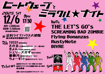 「ヒートウェーブとミラクル★ナイト」 2025年 12月6日(土) 足利ライブハウス大使館 < 出演 > THE LET'S GO's SCREAMING BAD ZOMBIE Flying Bonanzas RustyNote BIVRE < DJ > TOSSY(REVENGE!) さかゑ(上野のロックンローラー・竜兵会) きょん(Stoke general store) シェリーズかず(HEAT WAVE) 薔薇汚(足利ミラクルウーマン) ちょーすけ(足利ミラクルウーマン) < SHOP > 足利ミラクルウーマン < FOOD > CURRE DIEM |