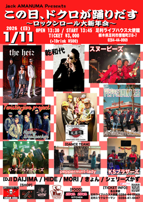 2026年1月11日(日) jack AMANUMA Presents この日、ドクロが踊りだす 〜ロックンロール大新年会〜 【BAND】 Peppermint55&乾和代 Harry wood pecker the heiz スヌーピーズ ぢオールナイターズ KSブラザーズ 續風羅坊 【DANCE TEAM】 peppermint-lady 【DJ】 DAIJIMA HIDE MORI シェリーズかず きょん 【SHOP】 SoWhat Cal coke COLORS 足利ミラクルウーマン 【FOOD】 ZOWAZOWA KITCHEN OPEN 13:30 / START 13:45 TICKET \3,000 (+1Drink \500) TICKET INFO e+ 各出演者 足利ライブハウス大使館 TEL 0284-44-0069 足利ミラクルウーマン TEL 0284-41-6647 会場 足利ライブハウス大使館 〒326-0826 栃木県足利市借宿町318-7 TEL 0284-44-0069 |