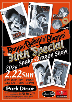 2026年 2月22日(日) BOPPIN' GALLOPIN' SLAPPIN' 30TH SPECIAL / SNAKE & DRAGON SHOW 【BAND】 スネーク&ドラゴン・ショー KATSUO HINO KENICHI YAMAGUCHI nob You-Dai 【DJ】 DJ-KATO (ex. ROCK-A-SPEED) SHINZ!! 【SHOP】 JOHNNY KOOL 足利ミラクルウーマン 参加させて頂きます!! OPEN 16:30 / START 17:30 前売¥4,500 当日¥5,000 【TICKET INFO】 slapbass.nob@gmall.com ※人数 代表者名必須 JOHNNY KOOL ※氏名、人数必須 足利ミラクルウーマン 0284-41-6647 ashimira@little-don.com チケット予約受付中!!! 会場 Park Diner 茨城県つくば市竹園1-9-2 DAYSTOWN B1 029-856-1777 |