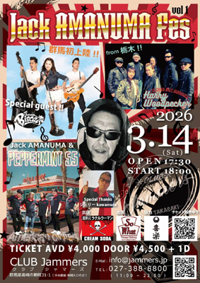2026年 3月14日(土) 「Jack AMANUMA Fes vol.1 」 【出演】 Jack AMANUMA & PEPPERMINT 55 The Biscats Harry Woodpecker 【出店】 So What 足利ミラクルウーマン Special Thanks:ジュリー kawamura 協力:喜楽 料金: 前売券¥4,000-(税込) ドリンク代別 当日券¥4,500-(税込) ドリンク代別 開場:17:30 開演:18:00 【問い合わせ】 高崎Club JAMMERS 027-388-8800(11:00〜22:00) TICKET INFO 高崎Club JAMMERS 027-388-8800(11:00〜22:00) info@jammers.jp 足利ミラクルウーマン 0284-41-6647 会場 高崎Club JAMMERS 〒370-0827 群馬県高崎市鞘町31?1 TEL:027-388-8800 |