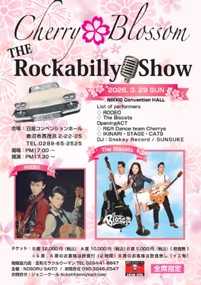 2026年 3月29日(日) cherry Blossam THE Rockabilly Show List of performers ◇RODEO ◇The Biscats OpeningACT ◇R&R Dance team Cherrys ◇IKINARI・STAGE・CATS DJ Snokey Record / SUNSUKE チケット S席 12,000円(税込) A席 10,000円(税込) B席 5,000円(税込){飲食無} ※S席、A席のお客様は飲食付(2時間) B席のお客様は飲食無し(イス有) 全席指定 開場:PM17:00〜 開演:PM17:30〜 物販協力店:足利ミラクルウーマン TEL 0284-41-6647 主催:NOBORU SAITO / お問合せ 090-3246-2547 お問合せ:ジョニークール ticket@johnnykool.com 会場 日晃コンベンションホール 鹿沼市西茂呂2-22-25 TEL 0289-65-2525 |