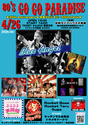 2026年4月26日(日) 80's GO GO PARADISE ★30th Anniversary & 木枯らしジョニー 55th Party★ 【出演】 BLUE ANGEL 木枯らしジョニー&ジョージ マルあ♪Be Bop Go Let's 雑猫 暴主〜BOOW'Z〜 女体盛り キャオリンキャッツ 【DJ】 Rocket Boss Rocket Teru Suga 【SHOP】 足利ミラクルウーマン 【FOOD】 キッチンマルあ商店 トキメキドーナツ OPEN 13:00 / START 14:00 TICKET ¥4,000 軽食付き (ドリンク代別途 ¥500) TICKET INFO キッチンマルあ商店 e+ 足利ミラクルウーマン TEL 0284-41-6647 各出演者 会場 足利ライブハウス大使館 〒326-0826 栃木県足利市借宿町318-7 TEL 0284-44-0069 |