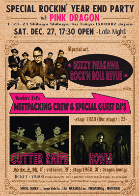 2025年12月27日(土) SPECIAL ROCKIN’ YEAR END PARTY at 粉紅之龍 ピンクドラゴン2F “STAGE 1950” 【出演】 Kozzy Iwakawa Rock'n Roll Revue CUTTERKNIFE HOWLS 【DJ】 MEETPACKING CREW, SPECIAL GUEST DJ’s ピンクドラゴン3F “DRAGON LOUNGE BAR” 開場 17:30 前売 5,000円 【チケット購入/問い合わせ】 PINK DRAGON : 03-3498-2577 COUNTER ACTION : 03-3370-9695 ROCKSVILLE ONLINE MEETPACKING Instagram DM 足利ミラクルウーマン にて予約受付中!!!! tel 0284-41-6647 会場 “PINK DRAGON” 〒150-0002 東京都渋谷区渋谷1−23−23 03-3498-2577 |