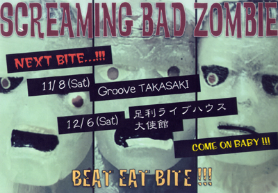 SCREAMING BAD ZOMBIE NEXT BITE...!!! 12/6(Sat) 足利ライブハウス大使館 COME ON BABY!!! BEAT EAT BITE!!! |