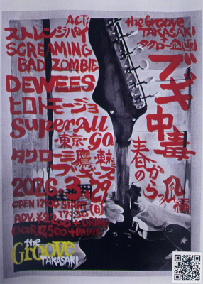 2026年 3月29日(日) タクロー三鷹ブギーズpresents 「ブギ中毒-春のからっ風 編-」 【出演】 ストレンジパイ SCREAMING BAD ZOMBIE DEWEES ヒロトモージョ Super All go (東京) タクロー三鷹ブギーズ (東京) OPEN 17:00 / START 17:30 ADV..¥2,200+D(¥600) DOOR..¥2,500+D(¥600) TICKET INFO 店頭予約 取置き予約(電話/メール) 出演者 会場 LIVE HOUSE the Groove TAKASAKI 〒370-0826 群馬県高崎市連雀町134番地 サファリビルB1 027-387-0895 (平日15:00?23:00まで) |