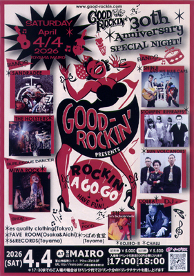 2026年4月4日(土) GOOD ROCKIN' 30th SPECIAL NIGHT! 【BAND】 SANDRA DEE(東京) SHINJI AND HIS BLUE CAPS(東京) STOMPIN' RIFFRAFFS(東京) SUN VOLCANOES(東京) THE HOLSTERS(東京) 【BURLESQUE】 MIWA ROCK(大阪) 【DJ】 DJ COBRA(東京) DJ SIN(東京) KOJIRO-!!!(富山) CHALU(富山) 【FOOD】 つばめ食堂(富山) 【SHOP】 esquality clothing(東京) FAVE ROOM(大阪&愛知) 56 RECORD(富山) 各バンド物販 OPEN 17:00 / START 18:00 前売券 \5,000 / 当日券 \5,500 入場時ドリンク代別途\600必要となります 【チケット取扱店】 es 小島屋 つばめ食堂 AUTO RAID Swan Dive BEATINK TATTOO STUDIO GOOD ROCKIN' 076-413-8796 1999@good-rockin.com 富山マイロ 076-455-1181 URL http://mairo.com/ 会場 富山マイロ 〒930-0003 富山県富山市桜町2-1-1 アミューズビル2F TEL 076-445-1181 |