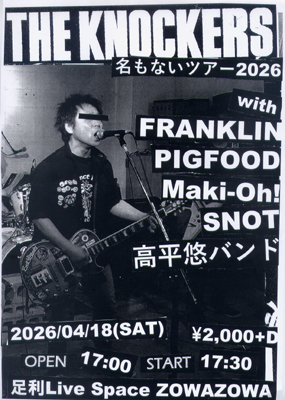 2026年4月18日(土) THE KNOCKERS 名もないツアー2026 【出演】 THE KNOCKERS FRANKLIN PIGFOOD Maki-Oh! SNOT 高平悠バンド OPEN 17:00 / START 17:30 TICKET ¥2,000+D 会場 足利Live Space ZOWAZOWA 〒326-0826 栃木県足利市借宿町318-7 2F TEL0284-22-7698 |