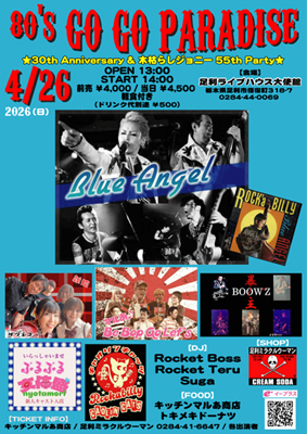 2026年4月26日(日) 80's GO GO PARADISE ★30th Anniversary & 木枯らしジョニー 55th Party★ 【出演】 BLUE ANGEL 木枯らしジョニー&ジョージ マルあ♪Be Bop Go Let's 雑猫 暴主〜BOOW'Z〜 女体盛り キャオリンキャッツ 【DJ】 Rocket Boss Rocket Teru Suga 【SHOP】 足利ミラクルウーマン 【FOOD】 キッチンマルあ商店 トキメキドーナツ OPEN 13:00 / START 14:00 前売 ¥4,000 / 当日 ¥4,500 軽食付き (ドリンク代別途 ¥500) TICKET INFO キッチンマルあ商店 e+ 足利ミラクルウーマン TEL 0284-41-6647 各出演者 会場 足利ライブハウス大使館 〒326-0826 栃木県足利市借宿町318-7 TEL 0284-44-0069 |