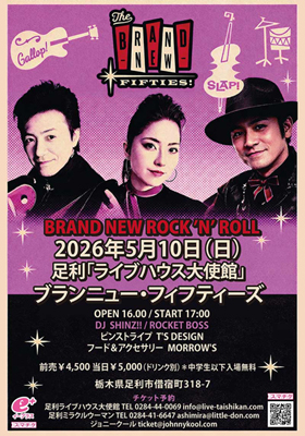 2026年 5月10日(日) 「BRAND NEW ROCK’N’ROLL」 【出演】 ブランニュー・フィフティーズ 【DJ】 SHINZ!! / ROCKET BOSS 【ピンストライプ】 T'S DESIGN 【フード&アクセサリー】 MORROW'S OPEN 16:00 / START 17:00 チケット料金: 前売¥4,500 当日¥5,000(ドリンク別) ※中学生以下入場無料 TICKET INFO e+ 足利ライブハウス大使館 TEL 0284-44-0069 足利ミラクルウーマン TEL 0284-41-6647 ジョニークール (氏名、人数必須) 会場 足利ライブハウス大使館 〒326-0826 栃木県足利市借宿町318-7 TEL 0284-44-0069 |