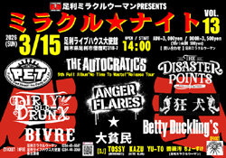 | 足利ミラクルウーマン PRESENTS 『ミラクル★ナイト Vol.13』 THE AUTOCRATICS 5th Full Album "No Time To Waste!" Release Tour 2026年 3月15日(日) INFO:足利ミラクルウーマン 0284-41-6647 OPEN / START 14:00 ADV-3,000yen / DOOR-3,500yen (1Drink別 500yen) ![]() ▲ CLICK HERE !! ▲ 会場:足利ライブハウス大使館 〒326-0826 栃木県足利市借宿町318-7 |